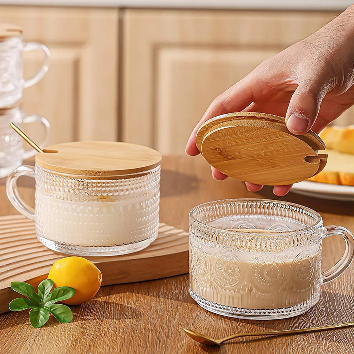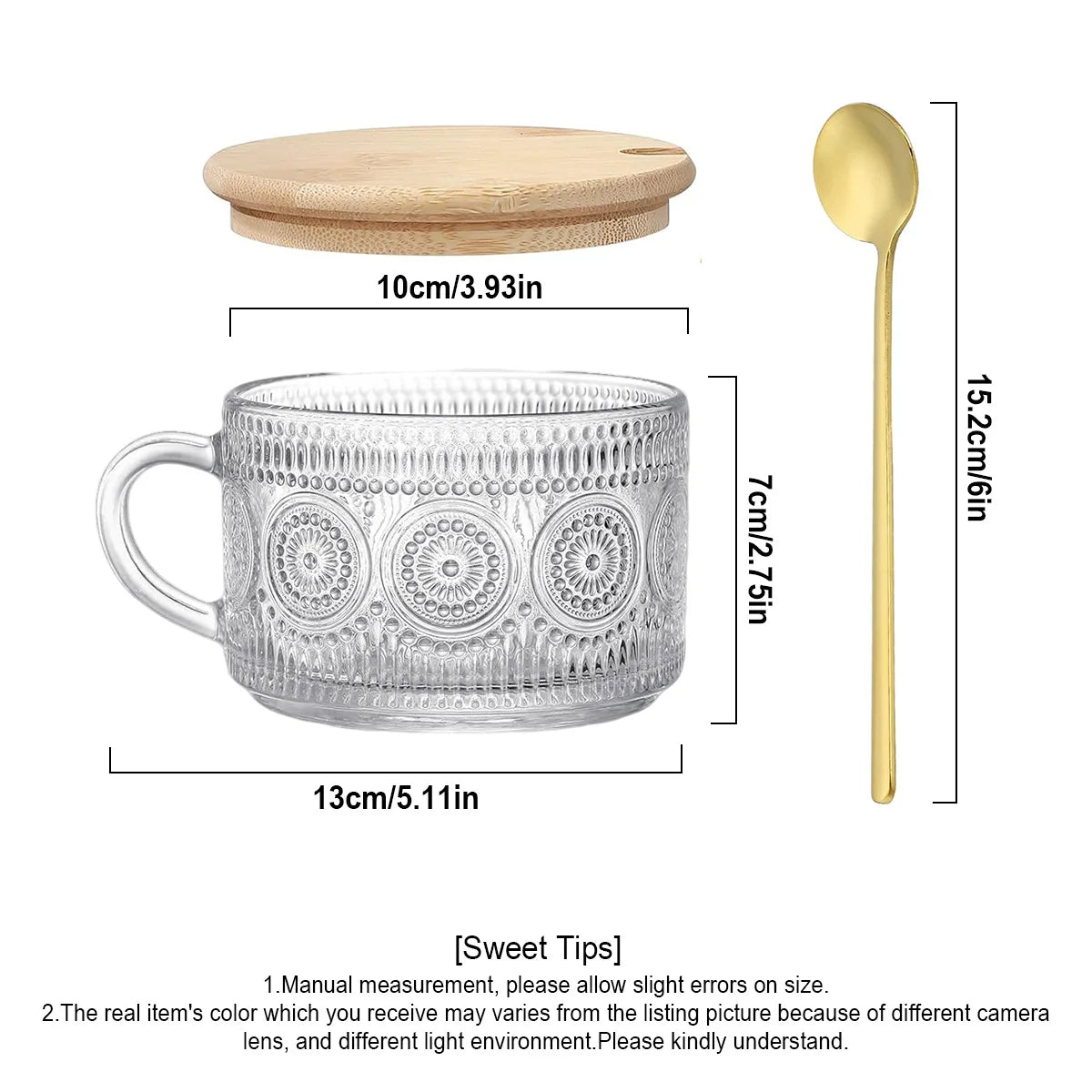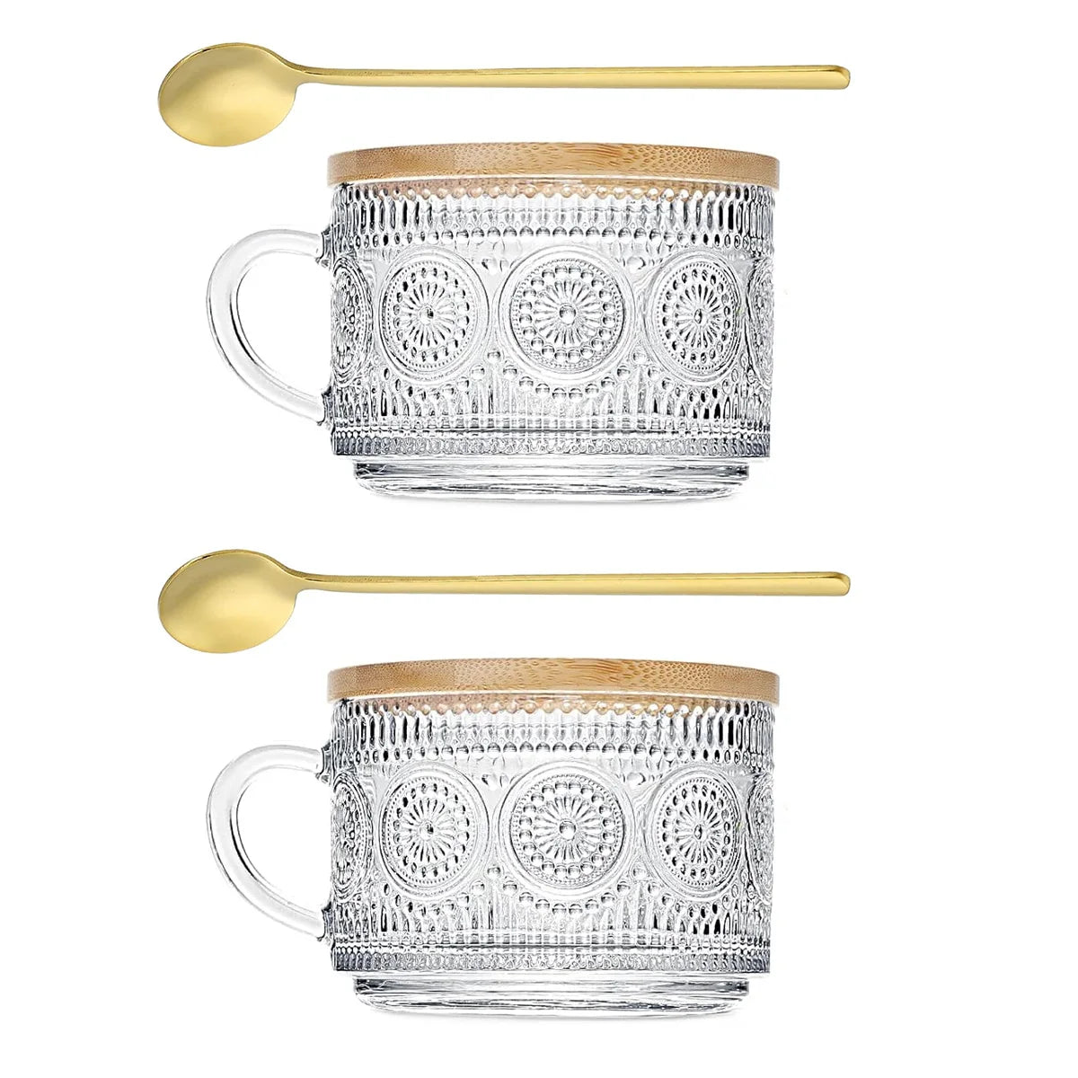 Et nydelig sett med to krus glass, preget med dekorative solsikkemønstre med lokk i bambus og skje.