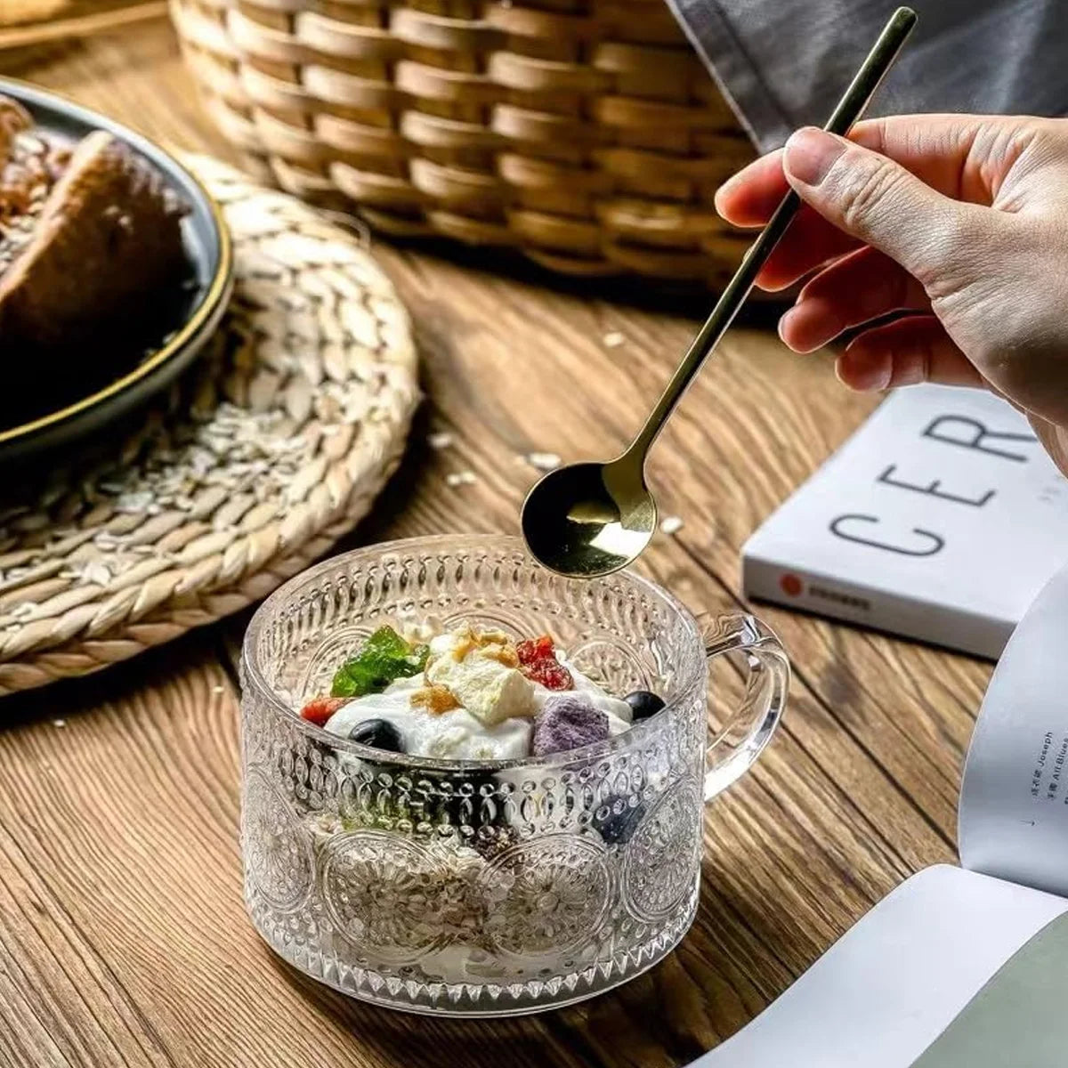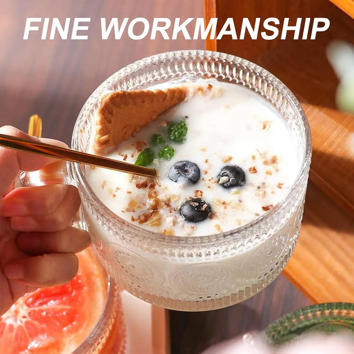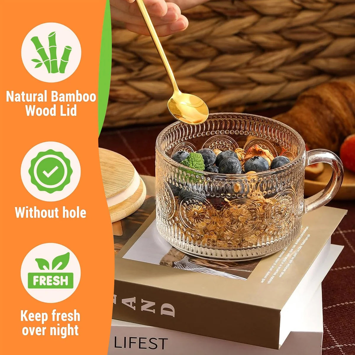 Et nydelig sett med to krus glass, preget med dekorative solsikkemønstre med lokk i bambus og skje.